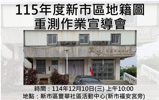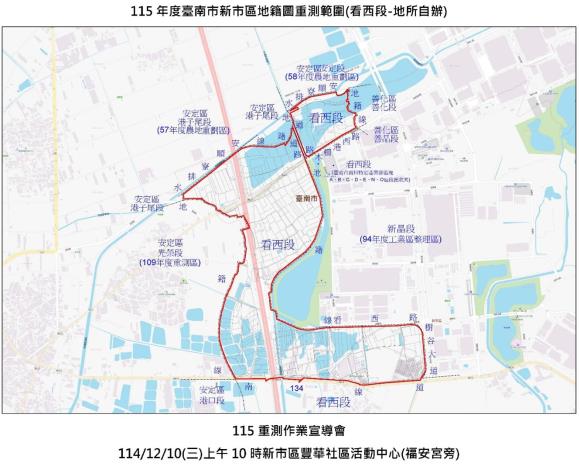 為使民眾更加了解相關作業內容、地籍圖重測之原因、意義、重要性以及說明相關法令規定及應配合與注意事項等有關地籍圖重測之重要資訊,保障地籍圖重測區土地所有權人之權益,本所訂於114年12月10日 (三) 上午10:00於「新市區豐華社區活動中心」(新市福安宮旁)辦理新市區看西段地籍圖重測作業說明會,民眾可至宣導會場洽詢地籍圖重測相關問題。另由本所委託測繪業者辦理地區之宣導說明會,則將另定日期,並通知土地所有權人。