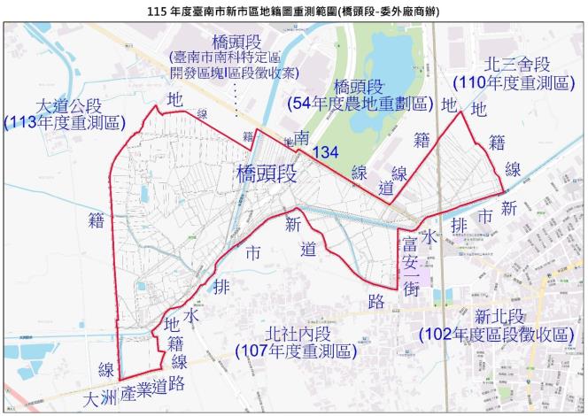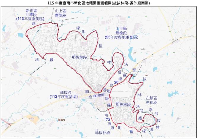 115地籍圖重測辦理期程自114年11月1日至115年12月31止,新化地政事務所辦理區域,規劃新市區看西段1212筆土地、面積131公頃。委託測繪業者辦理區域,規劃新市區橋頭段1244筆土地、面積101公頃;新化區𦰡拔林段1098筆土地、面積202公頃。