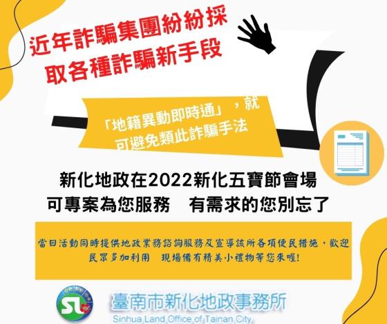本所「地政關懷行動列車」將參與「2022新化五寶節產業文化系列活動」不改服務熱忱,將在現場將提供地政[便民宣導]與[法令諮詢]服務。歡迎蒞臨諮詢,現場亦提供申辦「地籍異動即時通」服務,避免財產遭受詐騙手法致財產損失之情事發生。現場申請「地籍異動即時通」之民眾請備妥「所有權人身分證明文件及產權證明(可以拍照佐證)」現場完成程序者本所贈送精美禮物一份。