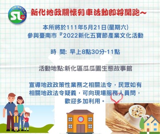 本所「地政關懷行動列車」將參與「2022新化五寶節產業文化系列活動」不改服務熱忱,將在現場將提供地政[便民宣導]與[法令諮詢]服務。